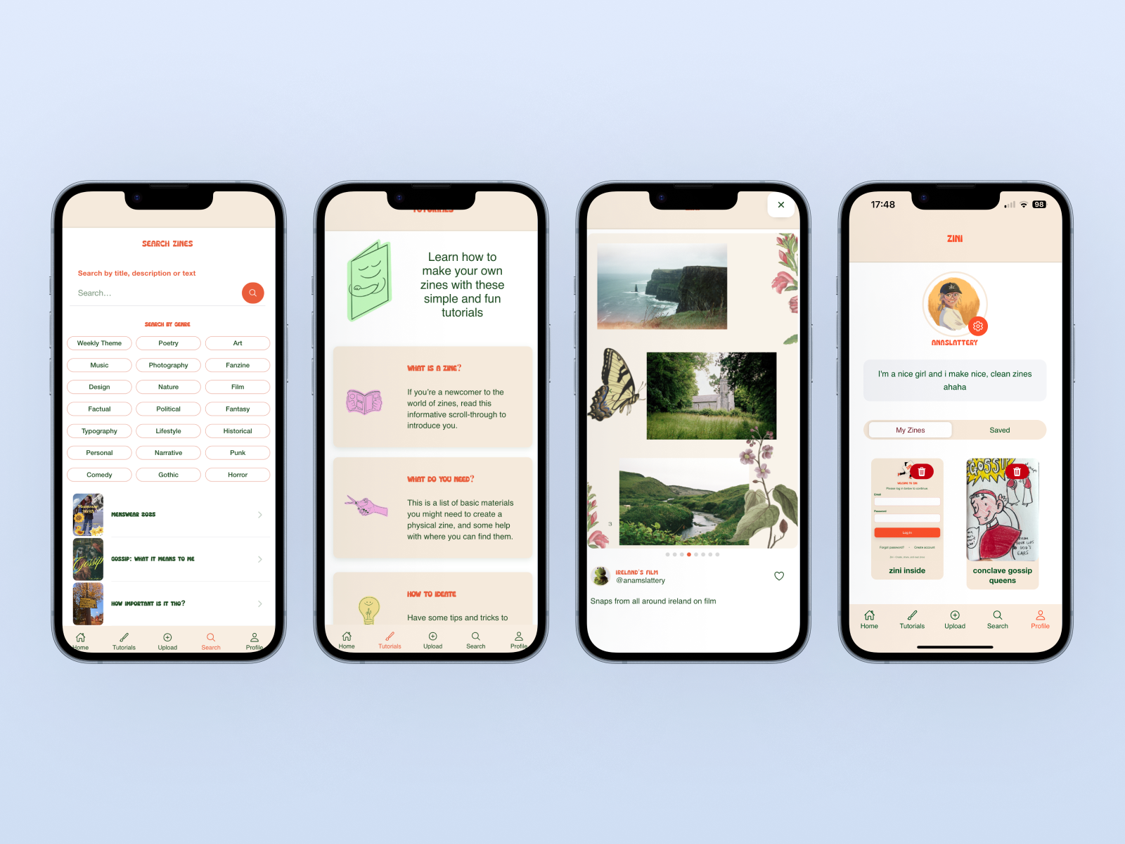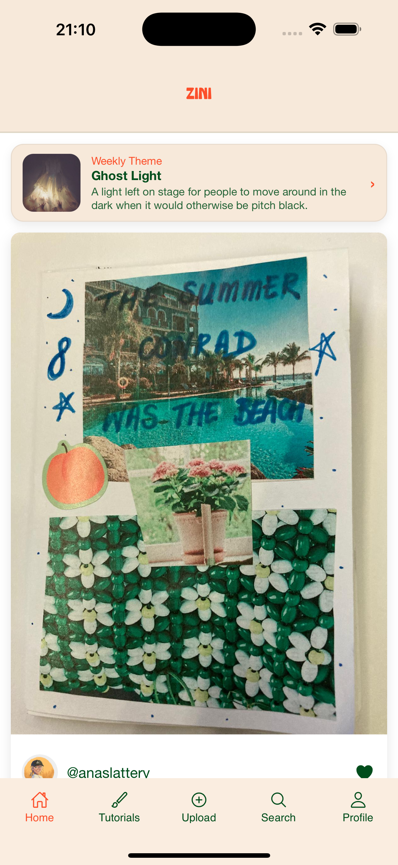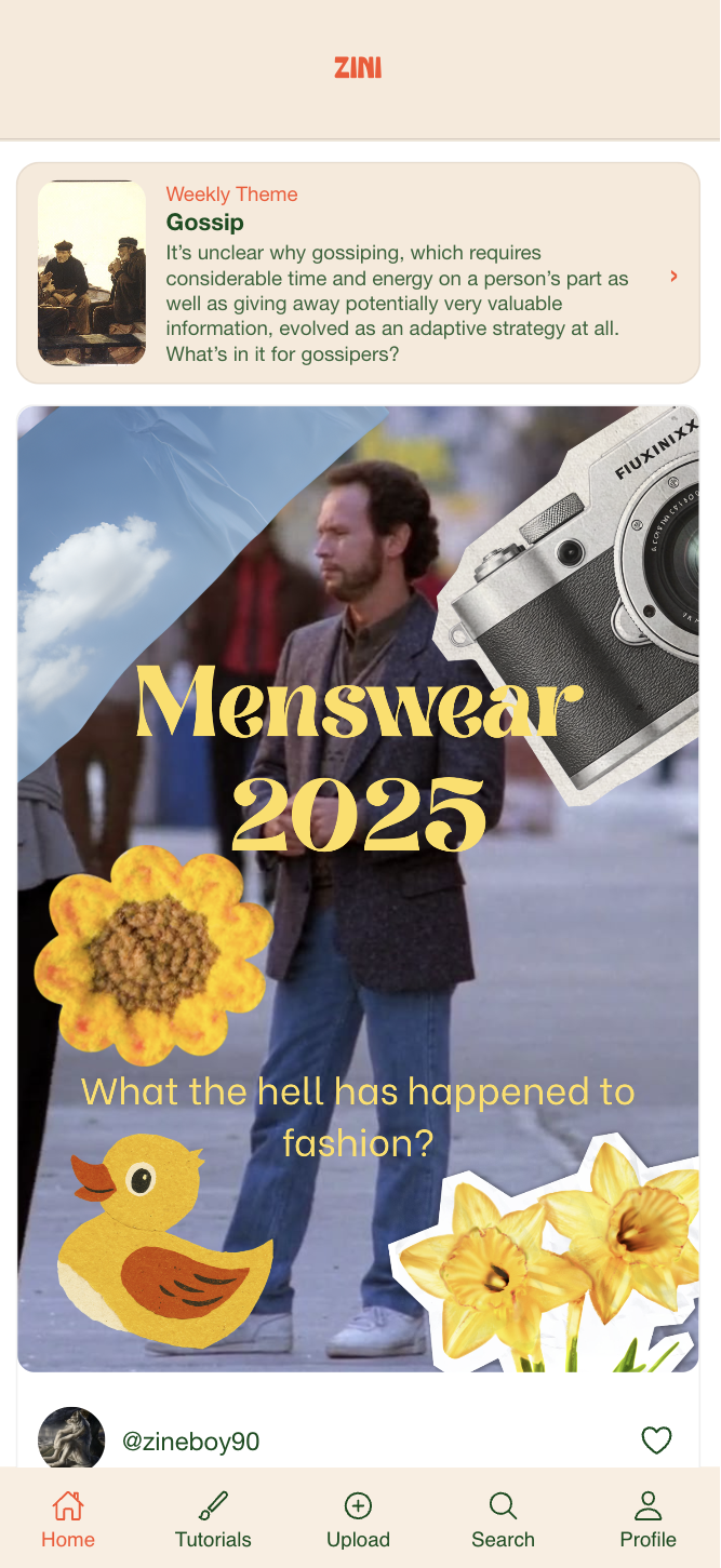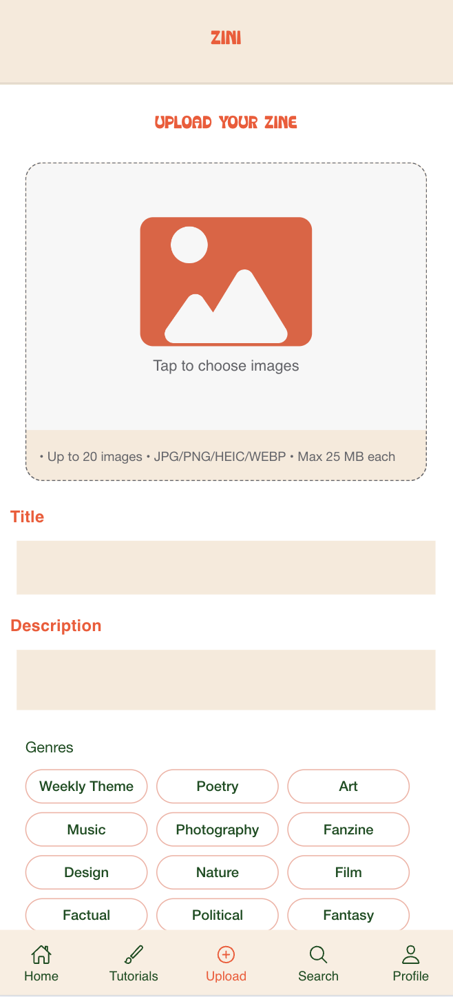Zini is a mobile application designed to support the creation and sharing of zines within a digital creative community. Zines are self-published works that are typically handmade and produced in small batches. They often take the form of small booklets or pamphlets and can explore a wide range of topics, including art, music, politics, and personal storytelling. Because there are no strict rules around format or content, zines have long been used as an accessible and low-pressure creative outlet. Zini translates this traditionally physical medium into a digital platform where users can create, upload, share, and discover zines. The goal of the app is to provide an inclusive space where people can express creativity without needing advanced artistic skills.
