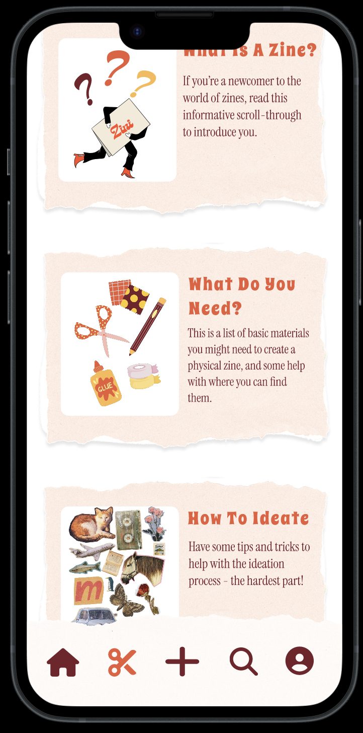 Most existing platforms function as static archives of zines. Zini was designed instead as a community-driven platform, allowing users to share, discover, and learn about zine creation in a more interactive environment.