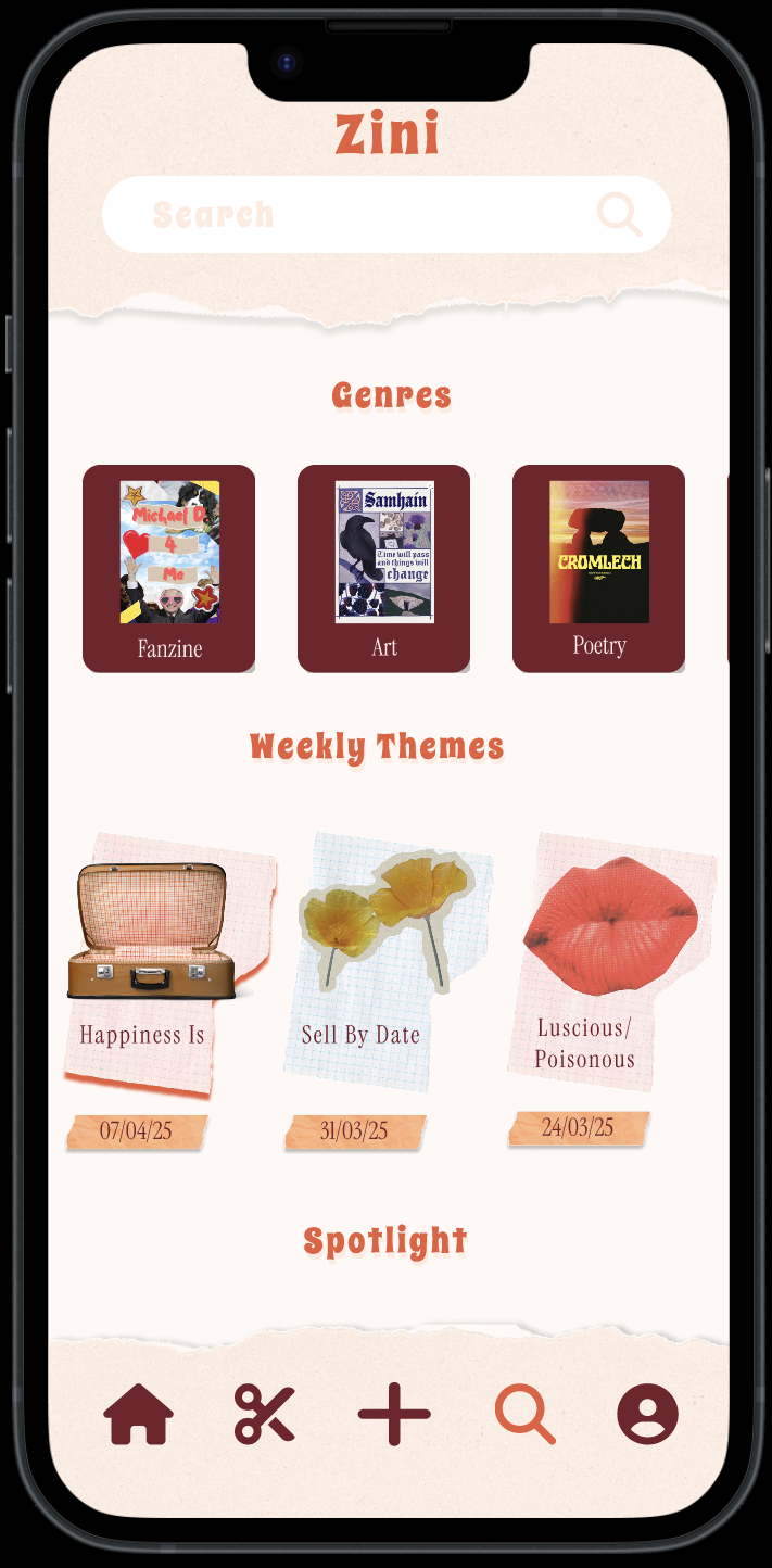 Search – a discovery page where users can browse zines by genre or search for specific topics.